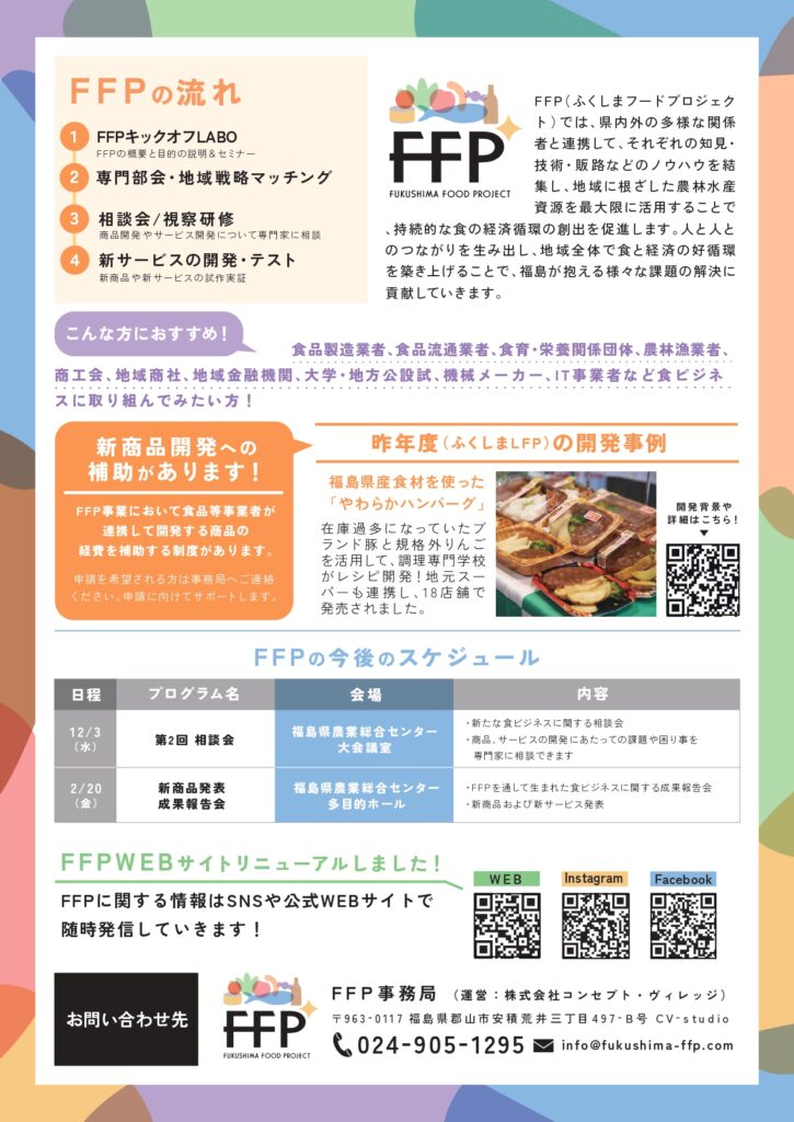 FFP では、8月のキックオフLABO を皮切りに、テーマへの理解を深める専門部会や、一緒に食ビジネスに取り組む仲間を見つける地域戦略マッチングを実施し、皆様と新商品開発の検討を進めてまいりました。